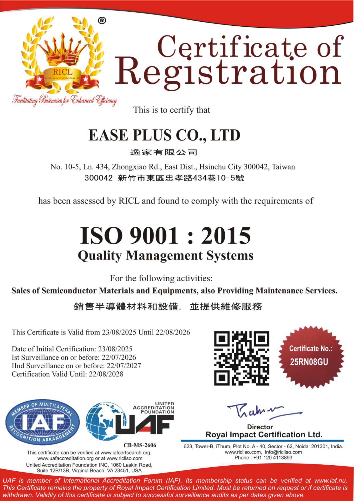 逸家有限公司 Ease Plus Co., Ltd. (EP) 自2016年成立以來宗旨是提供完整的解決方案替客戶解決各式樣的問題;不斷與合作夥伴攜手開發以及技術精進,得以提供客戶高信價比來滿足客戶全方位的應用需求,完善親切的售後服務獲得眾多客戶的支持與信賴,這幾年已成功在半導體領域與二極體領域成功開發獨到的技術,並且在2021年通過品質管理ISO 9001:2015國際認證。